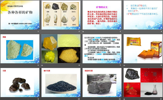 关键词:青岛版五年级下册科学PPT课件免费下载,各种各样的矿物PPT下载,.PPT格式;