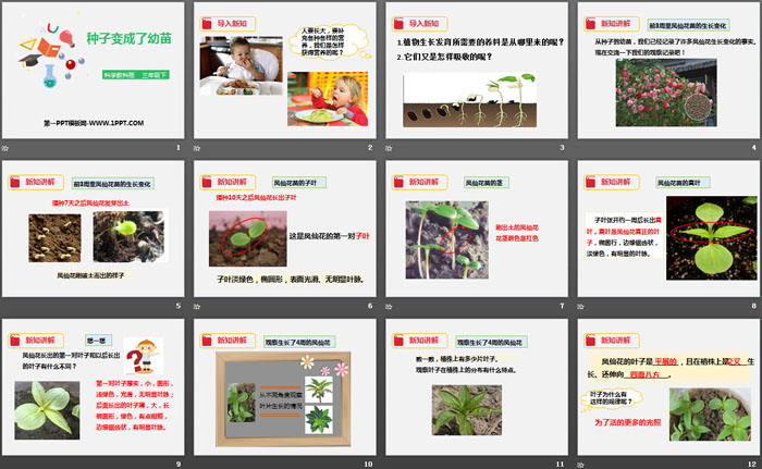 关键词:教科版三年级下册语文PPT课件免费下载,种子变成了幼苗PPT下载,植物的生长变化PPT下载,.PPT格式;