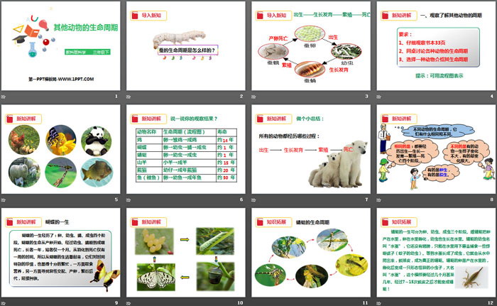 关键词:教科版三年级下册语文PPT课件免费下载,其他动物的生命周期PPT下载,动物的生命周期PPT下载,.PPT格式;