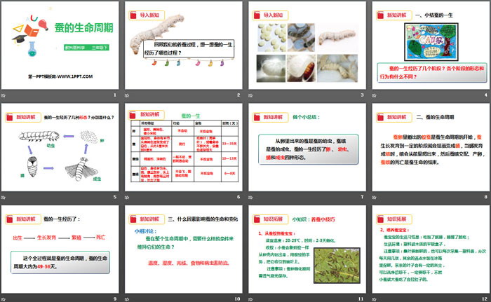 关键词:教科版三年级下册语文PPT课件免费下载,蚕的生命周期PPT下载,动物的生命周期PPT下载,.PPT格式;