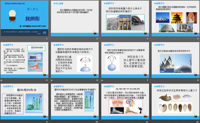 关键词:教科版六年级上册语文PPT课件免费下载,找拱形PPT下载,形状与结构PPT下载,.PPT格式;