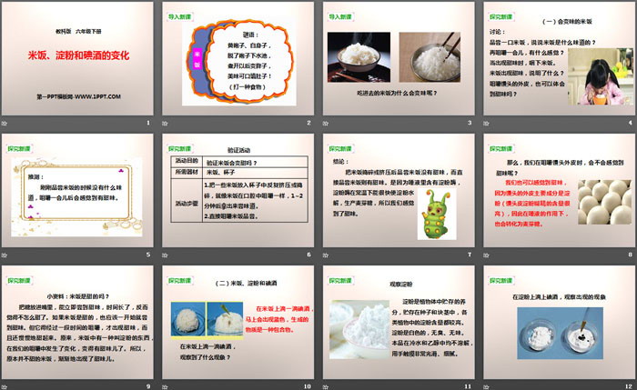 关键词:教科版六年级下册科学PPT课件免费下载,米饭淀粉和碘酒的变化PPT下载,物质的变化PPT下载,.PPT格式;