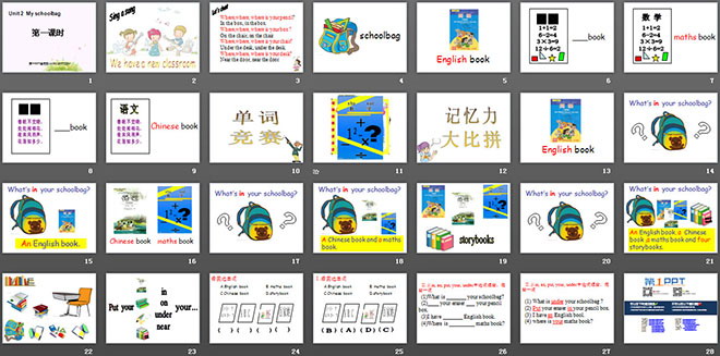 关键词:《My schoolbag》课件,新人教版四年级下册英语PPT课件,四年级英语幻灯片课件下载,《My schoolbag》PPT课件下载,.ppt格式