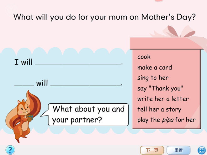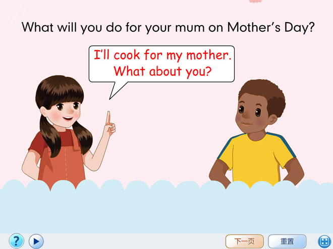 本课件通过动画的形式将《My school calendar》中的What will you do for your mum on Mothers day展示给学生,形象生动,趣味性强,是很好的英语教学辅助课件。