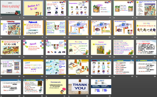 关键词:《Where's my schoolbag?》教学课件,人教版七年级上册英语课件,七年级英语幻灯片课件下载,《Where's my schoolbag?》PPT课件下载,.ppt格式