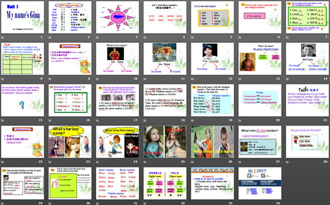 关键词:《My name's Gina》教学课件,人教版七年级上册英语课件,七年级英语幻灯片课件下载,《My name's Gina》PPT课件下载,.ppt格式