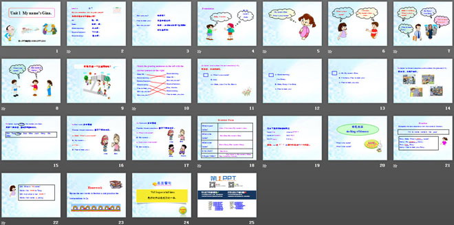 关键词:《My name's Gina》教学课件,人教版七年级上册英语课件,七年级英语幻灯片课件下载,《My name's Gina》PPT课件下载,.ppt格式