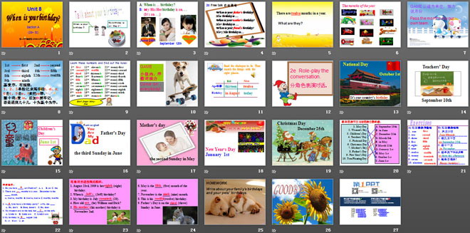 关键词:《When is your birthday?》教学课件,人教版七年级上册英语课件,七年级英语幻灯片课件下载,《When is your birthday?》PPT课件下载,.ppt格式