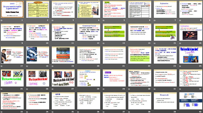 关键词:《Do you want to watch a game show》教学课件,人教版八年级上册英语课件,八年级英语幻灯片课件下载,《Do you want to watch a game show》PPT课件下载,.ppt格式