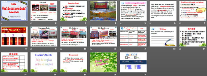 关键词:《What's the best movie theater?》教学课件,人教版八年级上册英语课件,八年级英语幻灯片课件下载,《What's the best movie theater?》PPT课件下载,.ppt格式