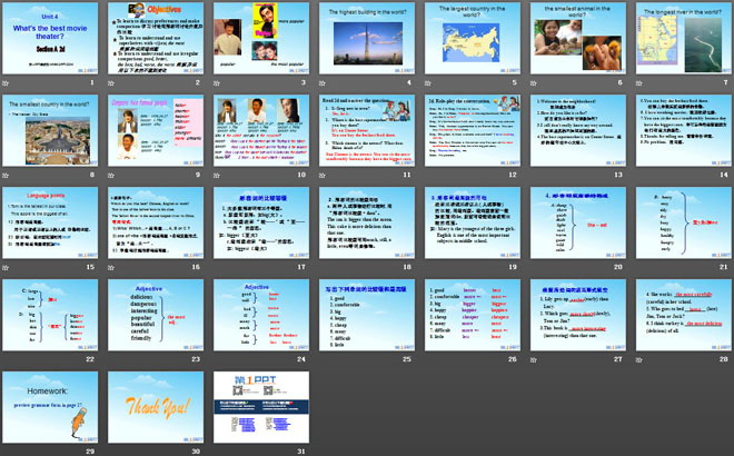 关键词:《What's the best movie theater?》教学课件,人教版八年级上册英语课件,八年级英语幻灯片课件下载,《What's the best movie theater?》PPT课件下载,.ppt格式