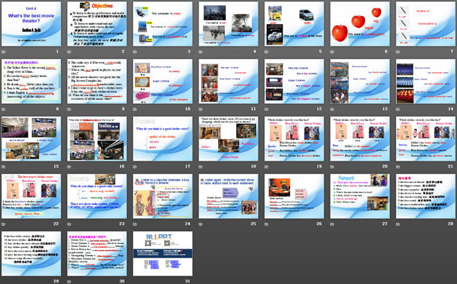 关键词:《What's the best movie theater?》教学课件,人教版八年级上册英语课件,八年级英语幻灯片课件下载,《What's the best movie theater?》PPT课件下载,.ppt格式
