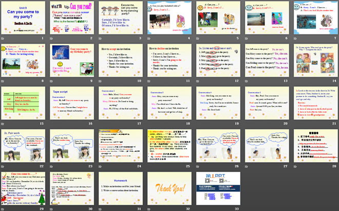关键词:《Can you come to my party?》教学课件,人教版八年级上册英语课件,八年级英语幻灯片课件下载,《Can you come to my party?》PPT课件下载,.ppt格式