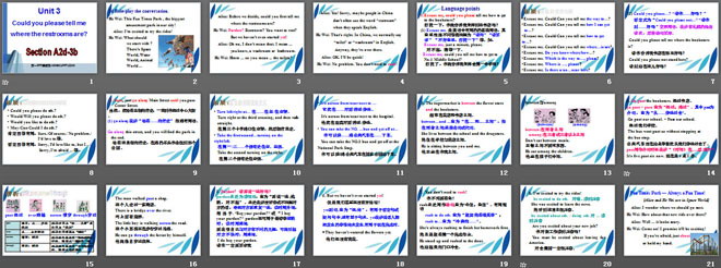关键词:《Could you please tell me where the restrooms are?》教学课件,人教版九年级上册英语课件,九年级英语幻灯片课件下载,《Could you please tell me where the restrooms are?》PPT课件下载,.ppt格式