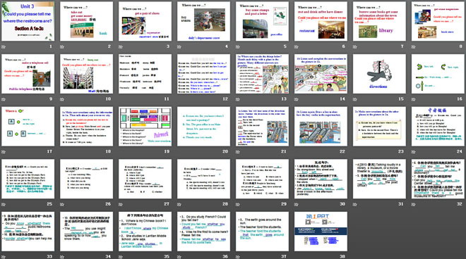 关键词:《Could you please tell me where the restrooms are?》教学课件,人教版九年级上册英语课件,九年级英语幻灯片课件下载,《Could you please tell me where the restrooms are?》PPT课件下载,.ppt格式
