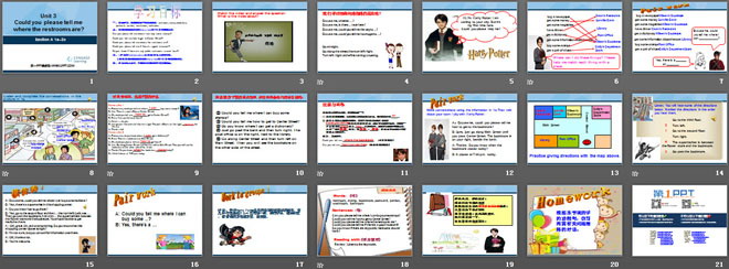 关键词:《Could you please tell me where the restrooms are?》教学课件,人教版九年级上册英语课件,九年级英语幻灯片课件下载,《Could you please tell me where the restrooms are?》PPT课件下载,.ppt格式