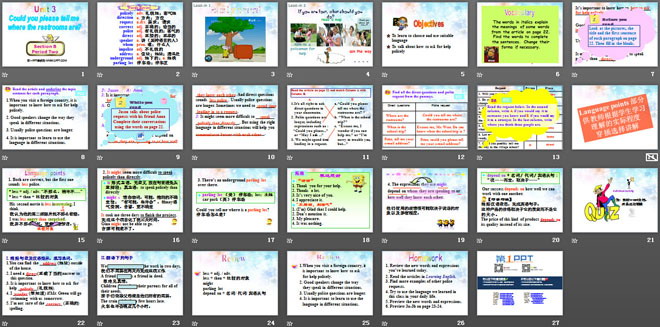 关键词:《Could you please tell me where the restrooms are?》教学课件,人教版九年级上册英语课件,九年级英语幻灯片课件下载,《Could you please tell me where the restrooms are?》PPT课件下载,.ppt格式