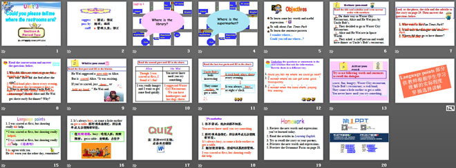 关键词:《Could you please tell me where the restrooms are?》教学课件,人教版九年级上册英语课件,九年级英语幻灯片课件下载,《Could you please tell me where the restrooms are?》PPT课件下载,.ppt格式