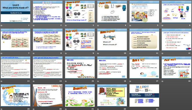 关键词:《What are the shirts made of?》教学课件,人教版九年级上册英语课件,九年级英语幻灯片课件下载,《What are the shirts made of?》PPT课件下载,.ppt格式