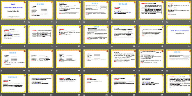 关键词:《What are the shirts made of?》教学课件,人教版九年级上册英语课件,九年级英语幻灯片课件下载,《What are the shirts made of?》PPT课件下载,.ppt格式