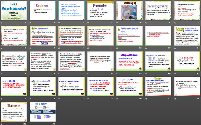关键词:《What are the shirts made of?》教学课件,人教版九年级上册英语课件,九年级英语幻灯片课件下载,《What are the shirts made of?》PPT课件下载,.ppt格式