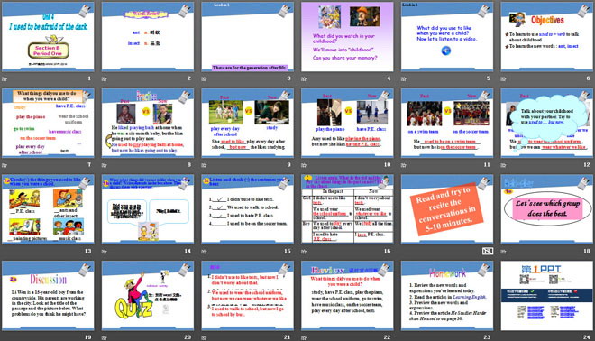 关键词:《I used to be afraid of the dark》教学课件,人教版九年级上册英语课件,九年级英语幻灯片课件下载,《I used to be afraid of the dark》PPT课件下载,.ppt格式