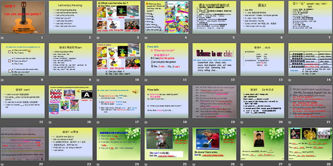 关键词:《Can you play the guitar?》教学课件,人教版七年级下册英语课件,七年级英语幻灯片课件下载,《Can you play the guitar?》PPT课件下载,.ppt格式