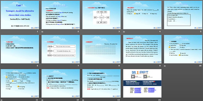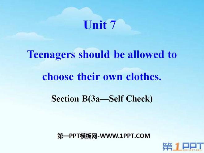 关键词:《Teenagers should be allowed to choose their own clothes》教学课件,人教版九年级上册英语课件,九年级英语幻灯片课件下载,《Teenagers should be allowed to choose their own clothes》PPT课件下载,.ppt格式