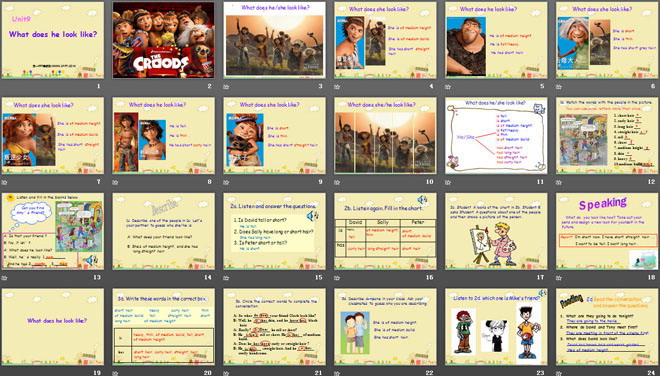 关键词:《What does he look like?》教学课件,人教版七年级下册英语课件,七年级英语幻灯片课件下载,《What does he look like?》PPT课件下载,.ppt格式