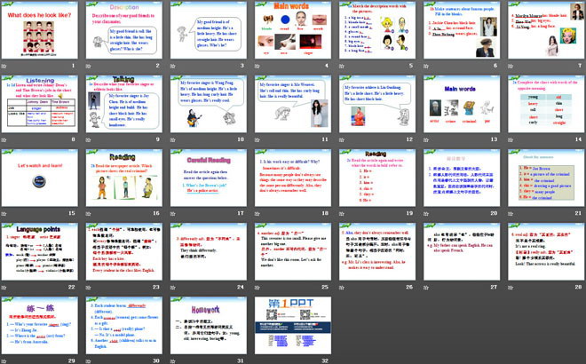 关键词:《What does he look like?》教学课件,人教版七年级下册英语课件,七年级英语幻灯片课件下载,《What does he look like?》PPT课件下载,.ppt格式