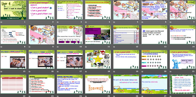 关键词:《Don’t eat in class》教学课件,人教版七年级下册英语课件,七年级英语幻灯片课件下载,《Don’t eat in class》PPT课件下载,.ppt格式