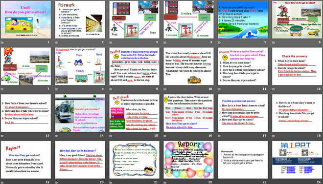 关键词:《How do you get to school?》教学课件,人教版七年级下册英语课件,七年级英语幻灯片课件下载,《How do you get to school?》PPT课件下载,.ppt格式
