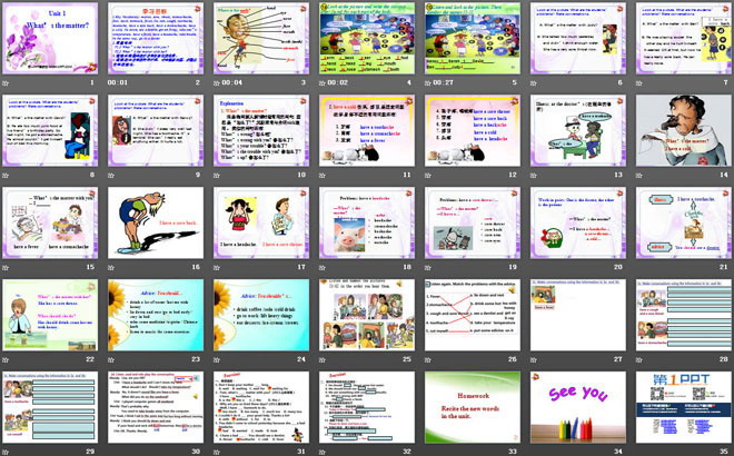 关键词:《What's the matter?》教学课件,人教版八年级下册英语课件,八年级英语幻灯片课件下载,《What's the matter?》PPT课件下载,.ppt格式