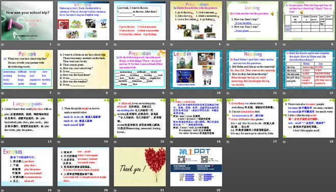关键词:《How was your school trip?》教学课件,人教版七年级下册英语课件,七年级英语幻灯片课件下载,《How was your school trip?》PPT课件下载,.ppt格式