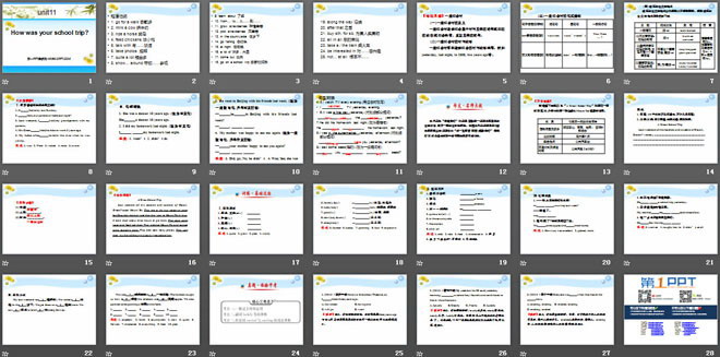 关键词:《How was your school trip?》教学课件,人教版七年级下册英语课件,七年级英语幻灯片课件下载,《How was your school trip?》PPT课件下载,.ppt格式