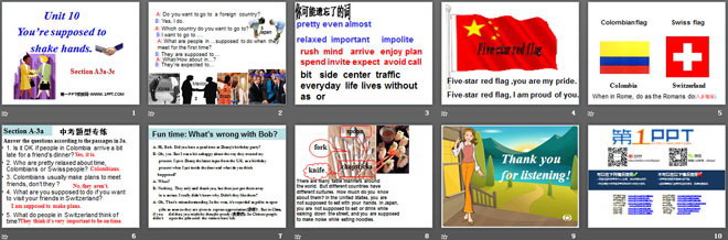 关键词:《You are supposed to shake hands》教学课件,人教版九年级下册英语课件,九年级英语幻灯片课件下载,《You are supposed to shake hands》PPT课件下载,.ppt格式