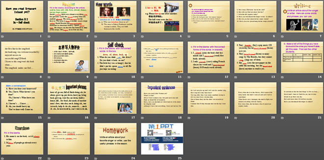 关键词:《Have you read Treasure Island yet?》教学课件,人教版八年级下册英语课件,八年级英语幻灯片课件下载,《Have you read Treasure Island yet?》PPT课件下载,.ppt格式