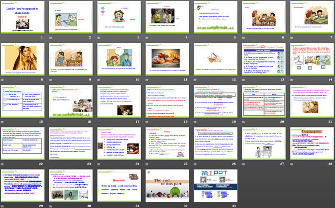 关键词:《You are supposed to shake hands》教学课件,人教版九年级下册英语课件,九年级英语幻灯片课件下载,《You are supposed to shake hands》PPT课件下载,.ppt格式