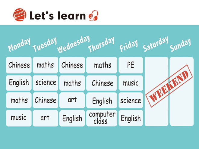 本课件通过动画的形式将《My week》中的lets learn展示给学生,形象生动,趣味性强,是很好的英语教学辅助课件。