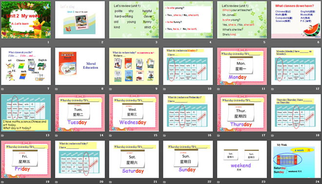 关键词:《My week》教学课件,人教版五年级上册英语课件,五年级英语幻灯片课件下载,《My week》PPT课件下载,.ppt格式