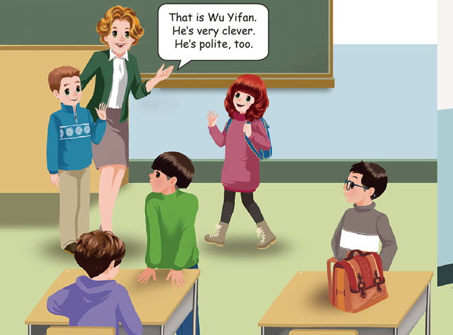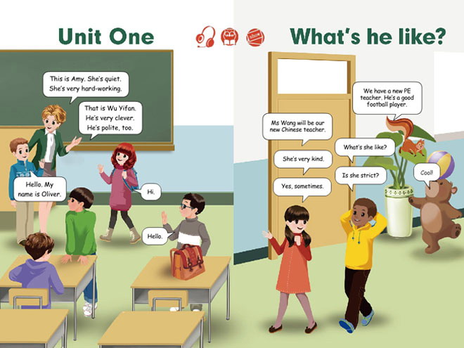 本课件通过动画的形式将《What's he like?》中的课文朗读展示给学生,通过多角色对话帮助学生学习本课内容,是很好的英语教学辅助课件。