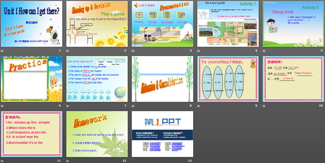 关键词:《How can I get there?》教学课件,人教PEP版六年级上册英语课件,六年级英语幻灯片课件下载,《How can I get there?》PPT课件下载,.ppt格式