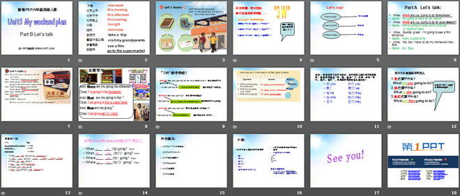 关键词:《My weekend plan》教学课件,人教PEP版六年级上册英语课件,六年级英语幻灯片课件下载,《My weekend plan》PPT课件下载,.ppt格式