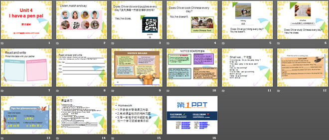 关键词:《I have a pen pal》教学课件,人教PEP版六年级上册英语课件,六年级英语幻灯片课件下载,《I have a pen pal》PPT课件下载,.ppt格式