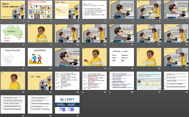 关键词:《I have a pen pal》教学课件,人教PEP版六年级上册英语课件,六年级英语幻灯片课件下载,《I have a pen pal》PPT课件下载,.ppt格式