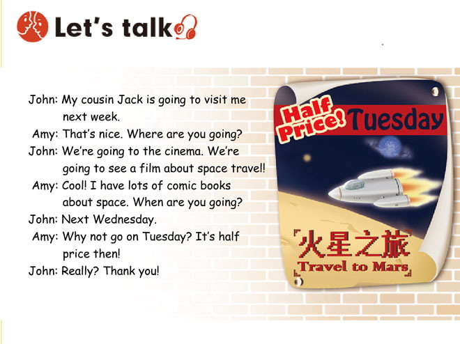 本课件通过动画的形式将《My weekend plan》中的let's talk展示给学生,形象生动,趣味性强,是很好的英语教学辅助课件。