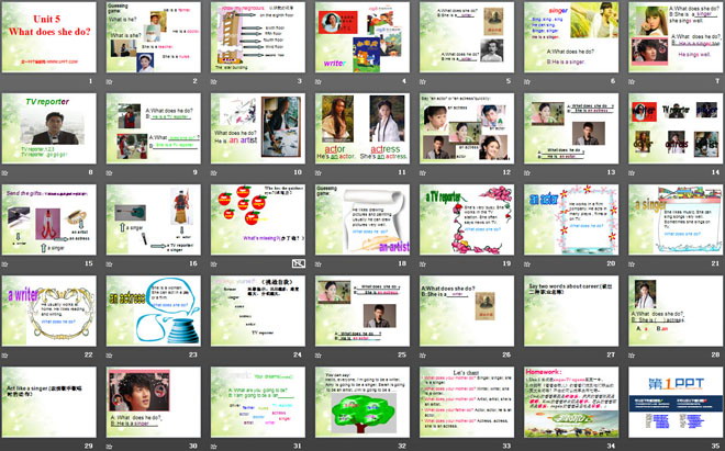 关键词:《What does he do?》教学课件,人教PEP版六年级上册英语课件,六年级英语幻灯片课件下载,《What does he do?》PPT课件下载,.ppt格式