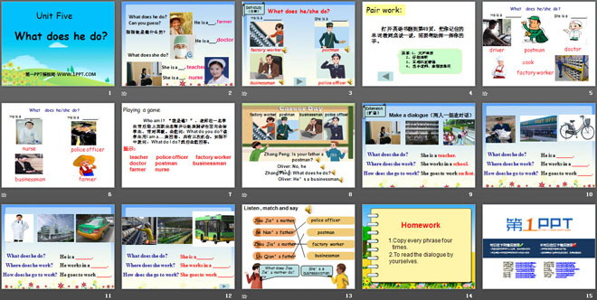 关键词:《What does he do?》教学课件,人教PEP版六年级上册英语课件,六年级英语幻灯片课件下载,《What does he do?》PPT课件下载,.ppt格式
