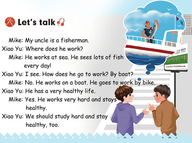 本课件通过动画的形式将《What does he do?》中的let's talk展示给学生,形象生动,趣味性强,是很好的英语教学辅助课件。
