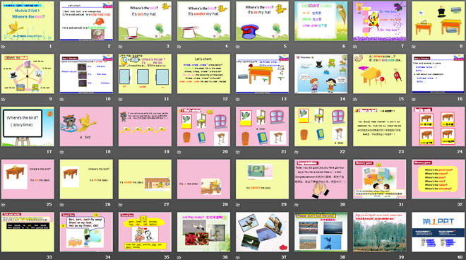 关键词:《Where’s the bird?》教学课件,外研版一起点一年级下册英语课件,一年级英语幻灯片课件下载,《Where’s the bird?》PPT课件下载,.ppt格式